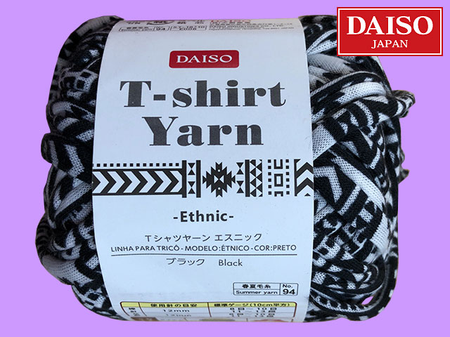 ■ダイソー この種の商品としては、異例のヒットとなったダイソーのTシャツヤーンから、『エスニック』2種。 #93 ミックス #94 ブラック ポリエステル100%、約30g(糸長約9m) <編み針の目安> 12mm <標準ゲージ> 9目12段 10cm平方メリヤス編み
