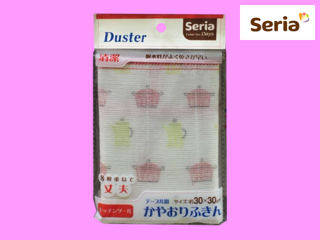 ■セリア セリアオリジナル、かやおりのテーブルフキン。 30cm × 30cm 8層構造で、吸水性がよいとされている。 シリーズには様々有り、画像は『キッチンツール』