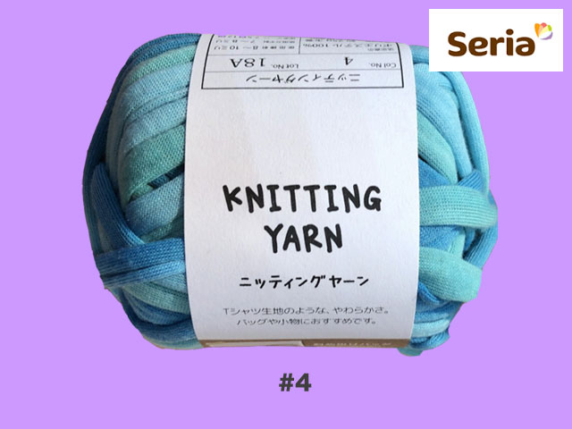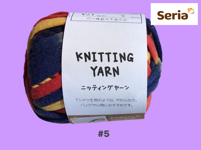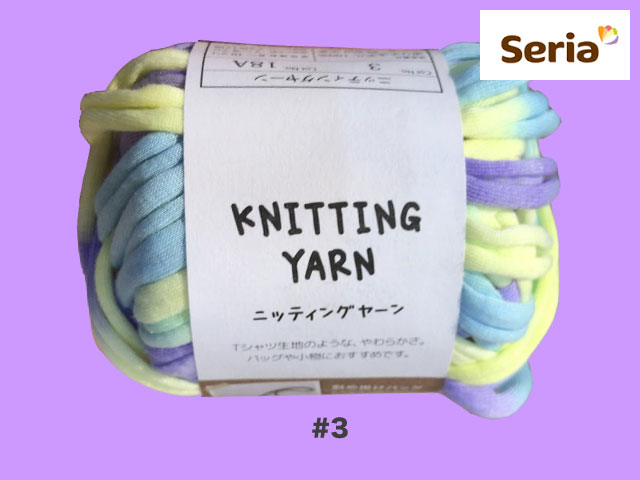 ■セリア(2017〜) 2017年末から発売された、ごしょう産業のズパゲッティ(Tシャツヤーン)。 ポリエステル100%、約25g(糸長約9m) <編み針の目安> 棒針 :8〜10mm カギ針:7〜8mm <標準ゲージ> 7.5目12段