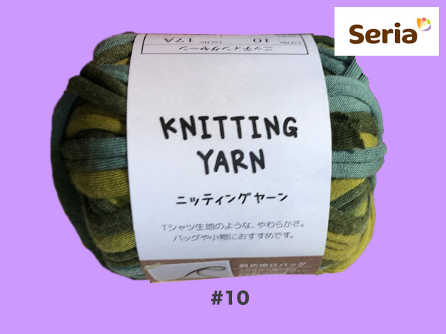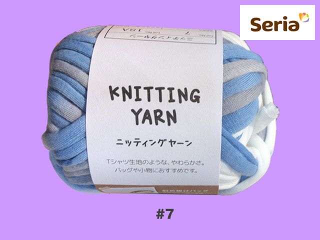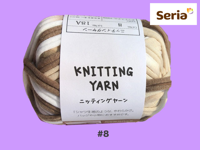 ■セリア(2017〜) 2017年末から発売された、ごしょう産業のズパゲッティ(Tシャツヤーン)。 ポリエステル100%、約25g(糸長約9m) <編み針の目安> 棒針 :8〜10mm カギ針:7〜8mm <標準ゲージ> 7.5目12段