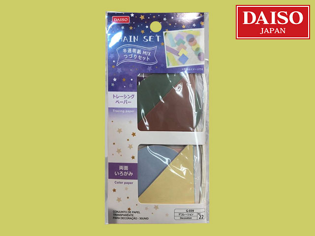 両面色紙と半透明のトレーシングペーパー、三角、丸、四角、の各5色がセットになったセット。こより6本入り。