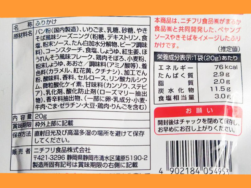 ダイソーほか ダイソー以外でも、ほとんど全てと言っていい100円ショップで扱われているニチフリ製。ペヤング(まるか食品)とのコラボ商品で、カップやきそば味ふりかけ。 内容量は20g(2023年現在) メーカー公式ページはコチラ (日本製)