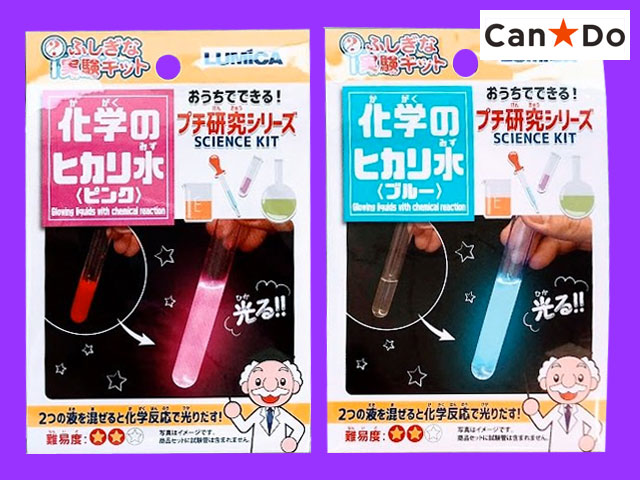 キャンドゥ キャンドゥの『おうちでできる!プチ研究シリーズ』から。『化学のヒカリ水』2色。 2種類の液体を混ぜ合わせて化学発の様子を観察し仕組みを学ぶキット 《キット内容》 ・蛍光液×1袋 ・酸化液×1袋 《おうちで用意するもの》 ・ガラス製容器またはプラコップ(ポリエチレン製・ポリプロピレン製) ・アルミホイル ・ゴム手袋またはポリエチレン手袋 ・ティッシュペーパーなど ・ポリ袋 詳細は百聞の動画で。 (中国製)
