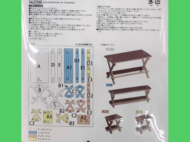 ■キャンドゥ ウッドクラフト。アウトドアシリーズから、ガーデン用テーブルとチェアセット。 一枚の板から各部品を抜き取って組み立てていく工作品。 抜き取った部品を付属の紙やすりで滑らかにしたら、設計図に合わせて順番通り組み立てると出来上がる。 本体サイズ 28.5×18.5 紙やすり1枚付き ※在庫限りで販売終了なので、欲しい方はお早めに。 (中国製)