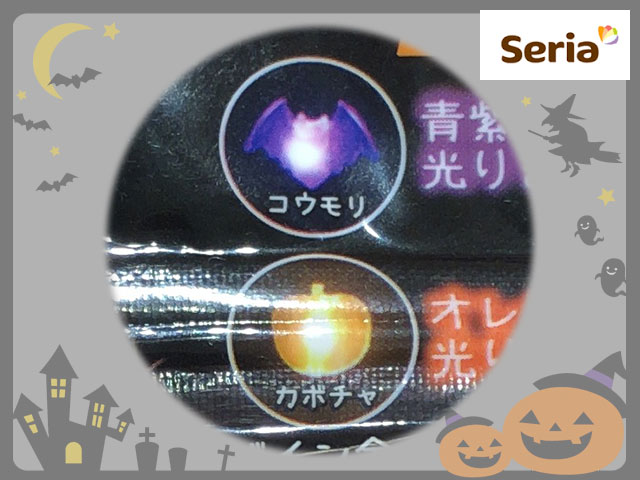 ■セリア(2018〜) 電池ボックス式のケーブル型LEDライト。 ケーブル長:約70cm LED数:5灯 単三型電池2本使用。 連続店頭時間約50時間。 オレンジ色に光る「カボチャ」と、青紫色に光る「コウモリ」の2種。 いずれも常時点灯式 (中国製)