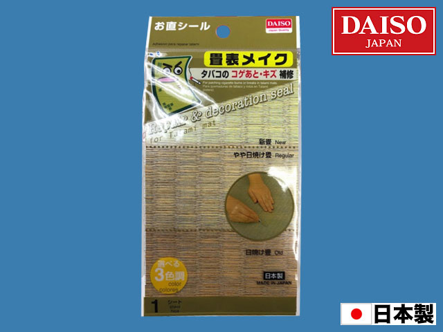 ■ダイソー タバコの焦げ跡など、畳の小さな部分を補修できる。 畳の日焼け具合に応じて3段階の色が用意されている。 シートサイズ:10cm × 17cm (日本製)