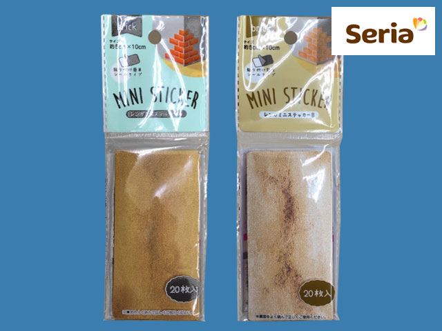 セリア 壁面装飾用のレンガステッカー。20枚入り サイズは、四×五二丁掛けより少し小さめの5cm × 10cm AタイプとBタイプ。他にウッドもある。 (中国製)