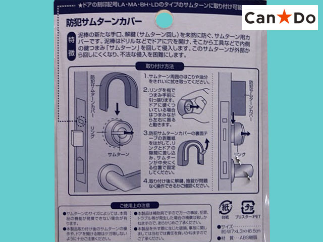 キャンドゥ キャンドゥオリジナル商品。ドアの内鍵(サムターン)にかける防犯カバー。 いざと言う時、あるとないとでは大きな違いになる。 サイズ:幅7cm × 奥行き3cm × 高さ6.5cm (中国製)