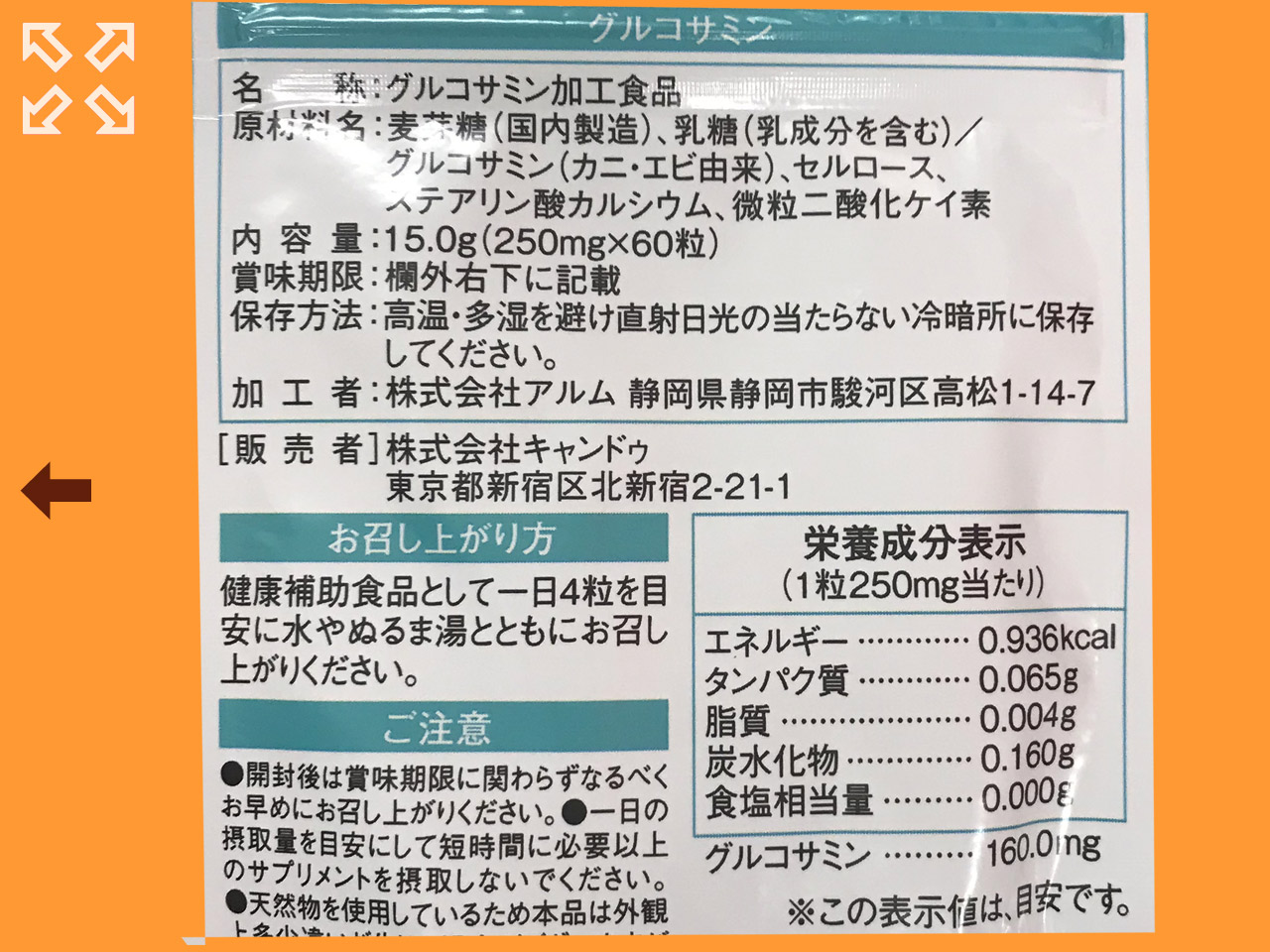 グルコサミン含有量は160mgで百均の中では最も割合が高いが、それでも一般市販されている物よりは、やはり低い。