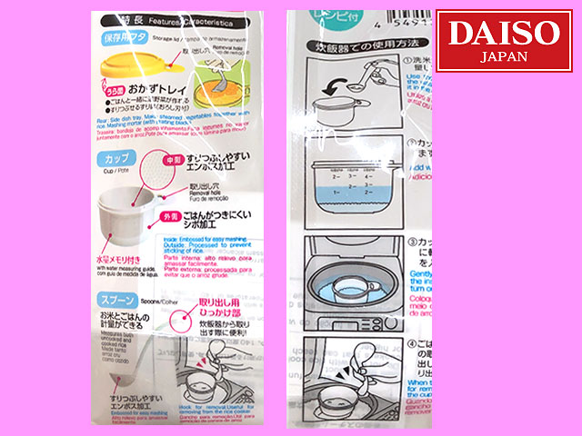 ダイソー [廃]は廃盤商品を意味しますが、店舗によって在庫されている場合もあります 炊飯時にご飯と一緒におかゆが作れる便利グッズ。 カップ内に計量済みの米と水を入れ、炊飯器内釜内にセット、通常の炊飯と同時におかゆ(水量に合わせて、5倍、7倍、10倍が指定可能)が炊ける。 また、本体蓋上で野温野菜も一緒に作れる。 食材をすりつぶすのに適したエンボス加工の計量スプーンつき。