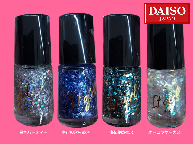 ■ダイソー(2018〜) 2018年12月から発売された『It girl』通称ITGシリーズのグリッターネイル、全8種。 ①恋のメロディ ②射止めてハート ③真夜中のミラーボール ④お目立ちさん ⑤星空パーティー ⑥海に抱かれて ⑦宇宙のきらめき ⑧オーロラサーカス (台湾製)