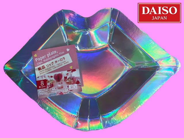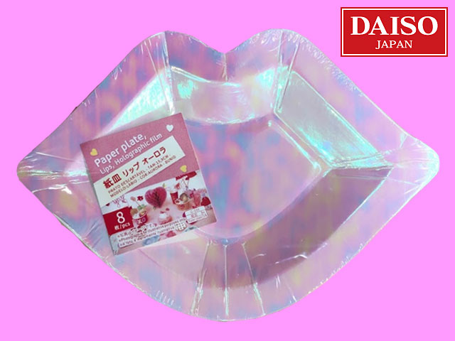 ■ダイソー(2019〜) メタリックの唇型紙皿、8枚セット。 サイズ: 15.9cm×10.9cm シリーズにハート型、丸型がある。 (中国製)