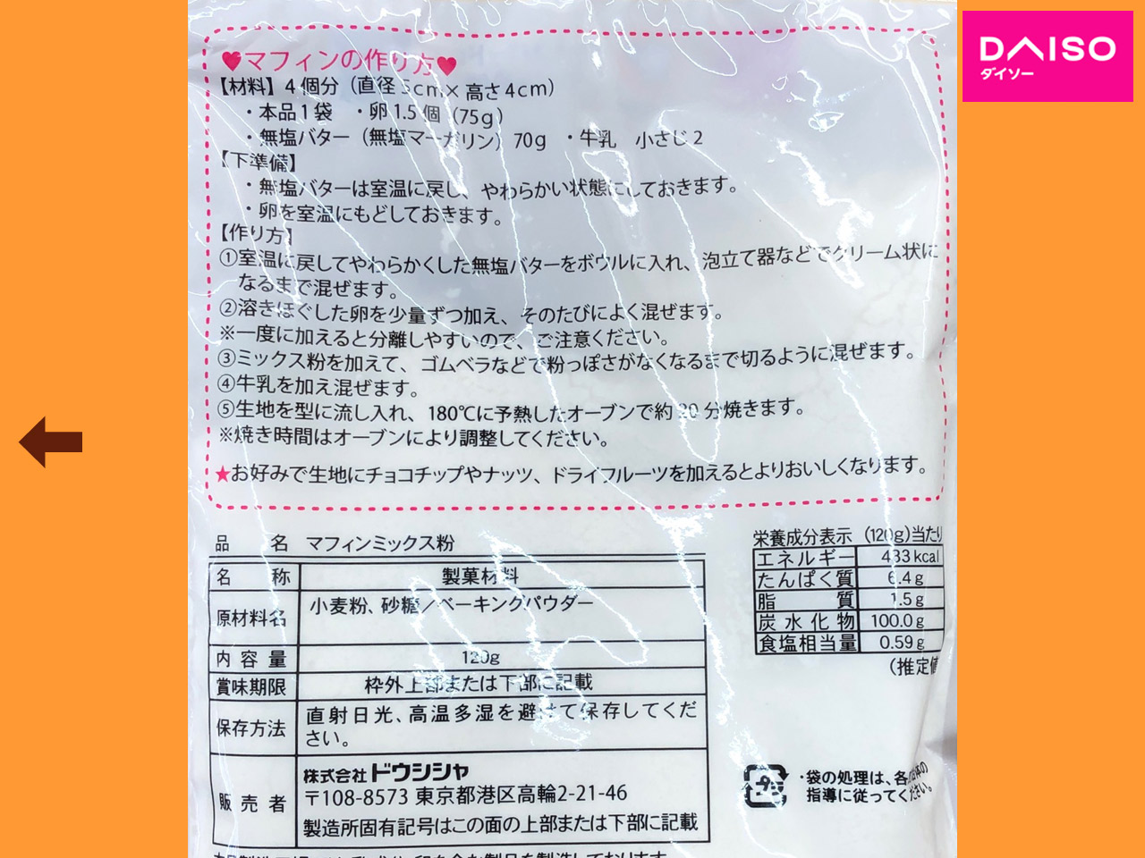 ダイソー セリアの独壇場だったクッキングパウダーにダイソーも参入。 マフィンのミックス粉プレーンタイプ、内容量120g。パッケージは2020年から変更されたもの。 ※クックパッド・タイアップページはこちら