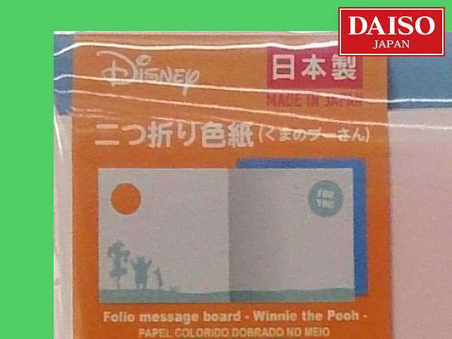 ■ダイソー(2018〜) プーさんの二つ折り色紙。 サイズ:二つ折り状態で約17cm×17cm 他、ミッキー、アリエル、モンスターズインクなどがある。 (日本製)
