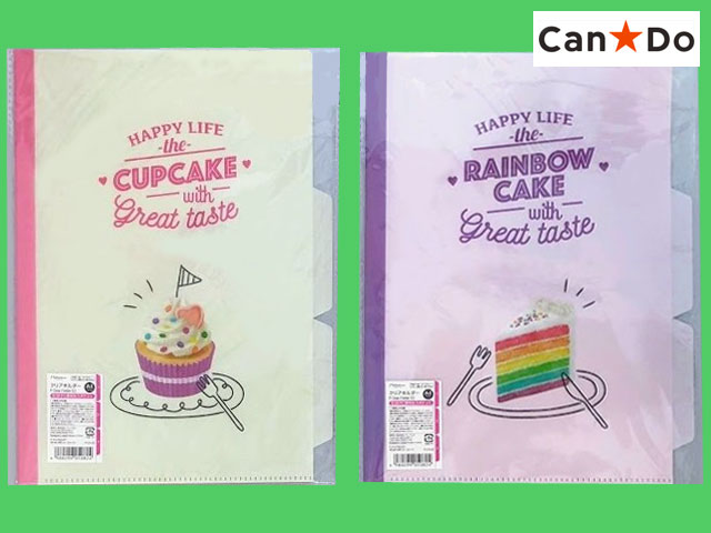 ■キャンドゥ(2019) 2019年2月より販売された「ジャンクフード」シリーズから。3ポケットのA4クリアファイル。 ジャンクフード柄2種と、スイーツ柄2種がある。 (中国製)