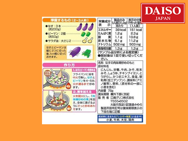 ダイソー(2015) グリコの『バランス食堂』シリーズ、茄子の肉味噌炒めの素 調理時間:約6分 内容量:78g(2回分) 引用:野菜によくからむ、バランスのよい甘辛味噌味です。