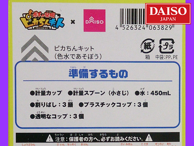 ダイソー(2019〜) 学研の自由研究用、夏の実験キットシリーズに2019年から追加された『色水であそぼう!』 キット内容は、 ①紫芋パウダー 1袋 ②クエン酸   1袋 ③重曹     1袋 ④スポイト   1本