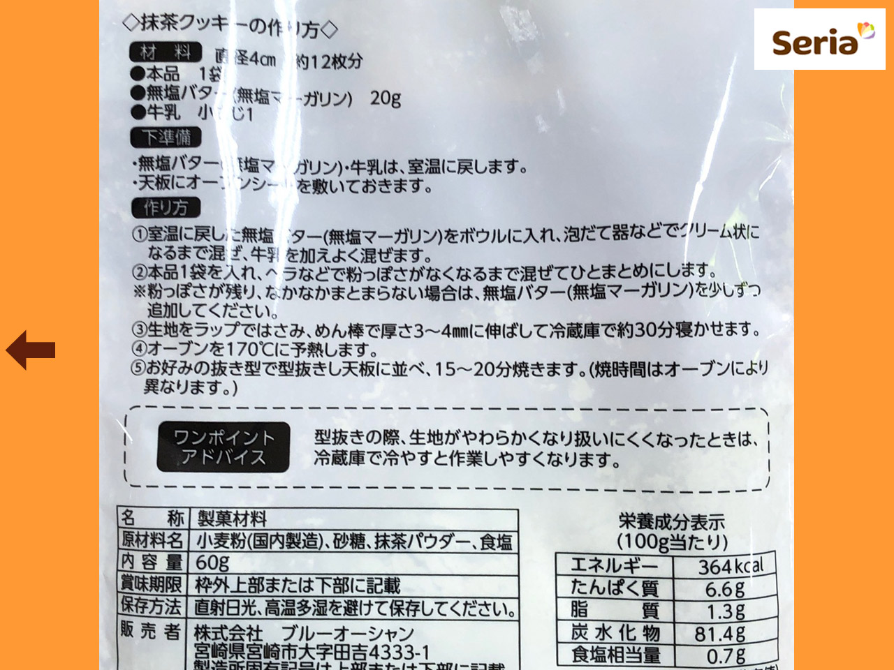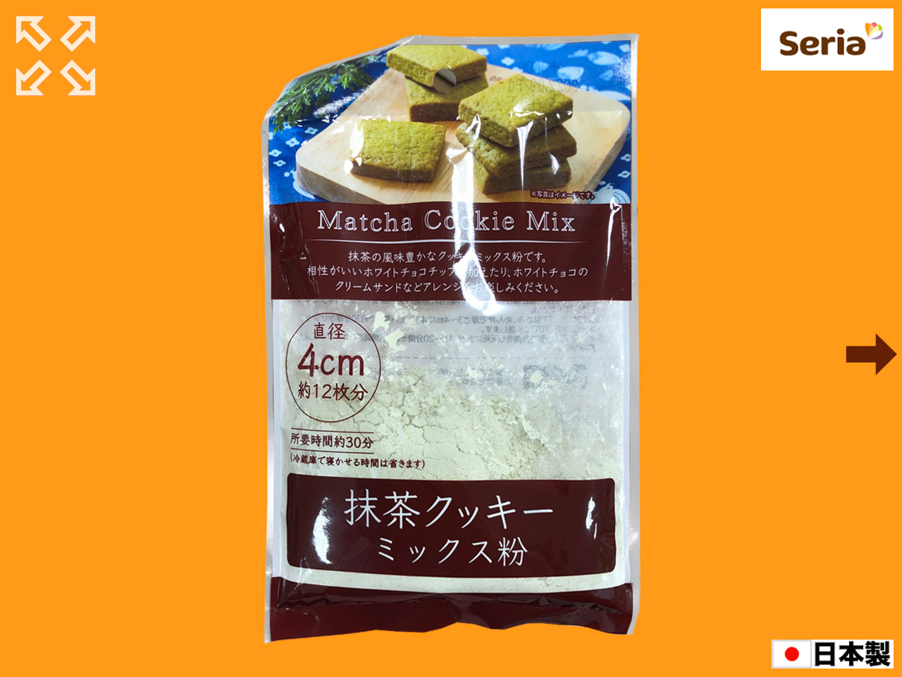 セリア(2021〜) セリアがシリーズ展開しているケーキミックス粉。 約4cmの抹茶味のクッキーが12個つくれる。原材料の違いか、イチゴ味より3枚分少ない。 調理所要時間は約30分。 2021年から、製造販売元が「(株)私の台所」から、(株)ブルーオーシャンに換わった。「私の台所」時代より、かなりパッケージデザインがダサくなった。残念。