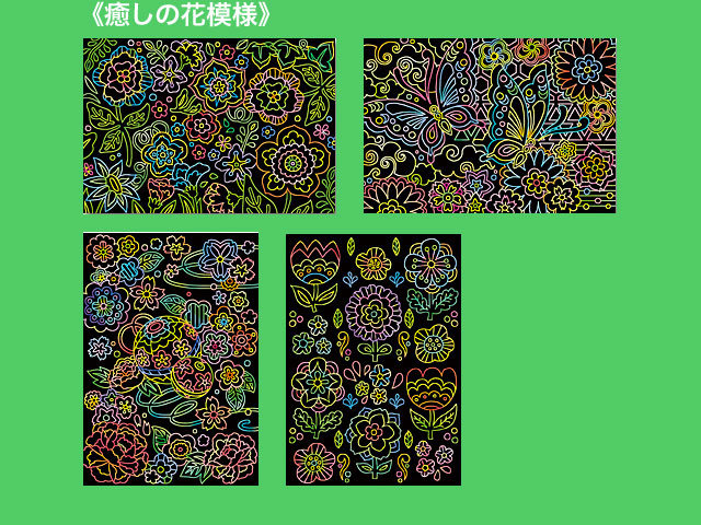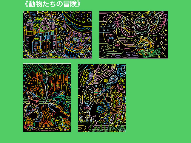 ダイソー(2019〜) 白いラインに沿って専用ペンで削ると、鮮やかなイラストが現れる新感覚のアート。 2019年現在で全6種類が販売されており、そのうちの3種類。 ①メルヘンの森 ②癒しの花模様 ③動物たちの冒険 各4シート入り。 サイズ:18.7cm×13cm (台湾製)
