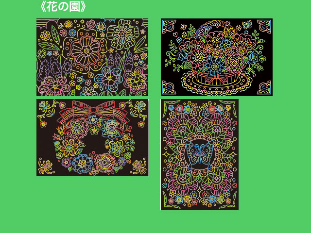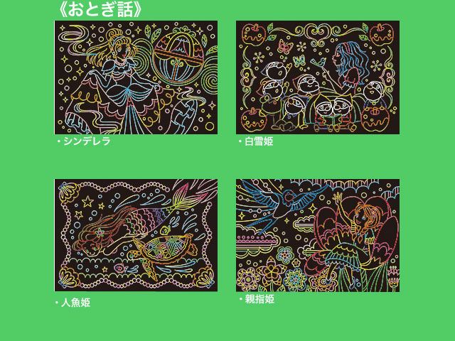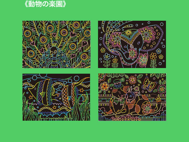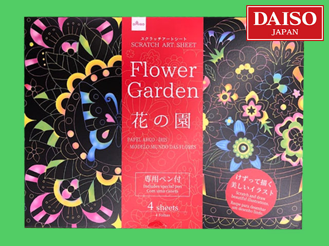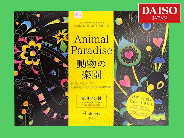 ダイソー(2019〜) 白いラインに沿って専用ペンで削ると、鮮やかなイラストが現れる新感覚のアート。 2019年現在で全6種類が販売されており、そのうちの3種類。 ④おとぎ話 ⑤花の園 ⑥動物の楽園 各4シート入り。 サイズ:18.7cm×13cm (台湾製)
