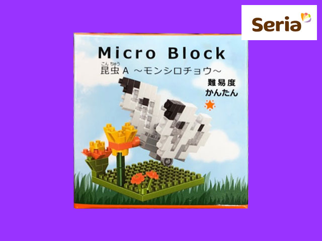 セリア セリアのミニブロック。「昆虫A」シリーズは蝶。 全3種類の構成で、いずれも難易度は低い。 ①モンシロチョウ 難易度:★☆☆ ②オオルリアゲハ 難易度:★☆☆ ③ナミアゲハ   難易度:★☆☆ (中国製)
