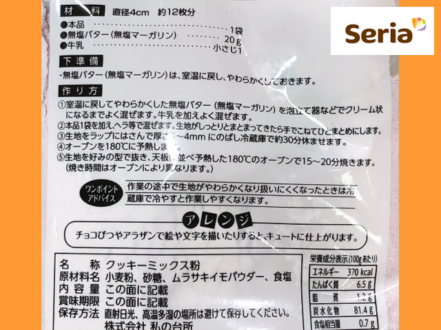 セリア セリアがシリーズ展開しているケーキミックス粉。 直径4cmのクッキー12枚分。 むらさきいもの自然な甘さと、きれいな色合いで、舌も目も楽しめる。 焼き上がり後にトッピングを加えることで、さらにカラフルな色合いに。 少し珍しい素材も手軽に扱えるのは、ミックス粉ならではの利点。 調理所要時間は約30分。