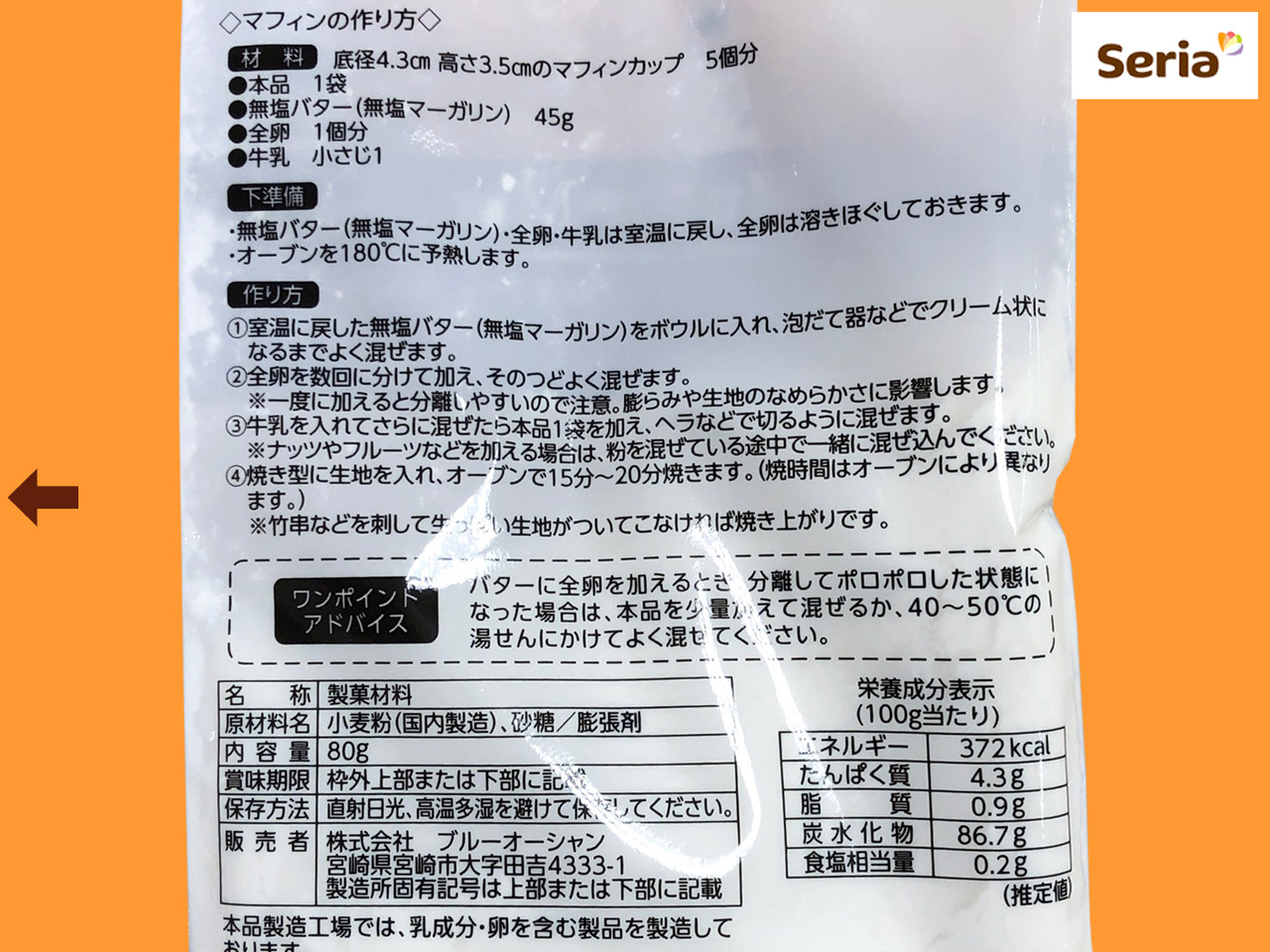 ■セリア(2021~) セリアがシリーズ展開しているケーキミックス粉。 直径6.5cm×高さ5cmのマフィンカップ2個分。 プレーンタイプなので、混ぜ込む素材をかえることで色々な味が楽しめる。 調理所要時間は約40分。 2021年からメーカーとパッケージが変わった。