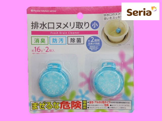 ■セリア 排水口のヌメリとり。 大(約5週間持続)、小(約2週間持続)2個入りの2種類。 ※塩素系なので、アルカリ性洗剤とは混ぜられない。 (中国製)