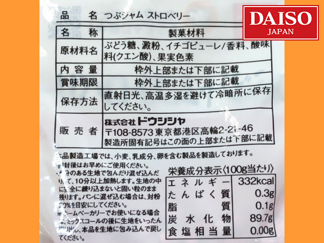 ■ダイソー(2018〜) パンやマフィンに混ぜて焼き上げると、イチゴジャムに変化する。 シリーズに、練乳イチゴが別途ある。内容量は、ともに30g