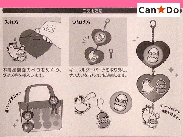 キャンドゥほか(2020〜) 中にバッヂなどを入れられるキーホルダー。 下に連結できる形状になっている。 ハートの大きさは約7cmほど。 (中国製)