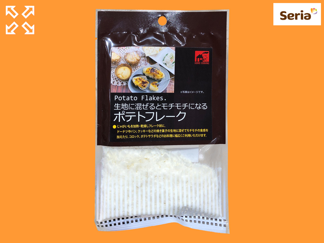■セリア(2020〜) お湯を入れて蒸らすだけで、マッシュポテトができるポテトパウダー。 お菓子、サラダ作りに。 内容量:20g 遺伝子組み換え不使用。