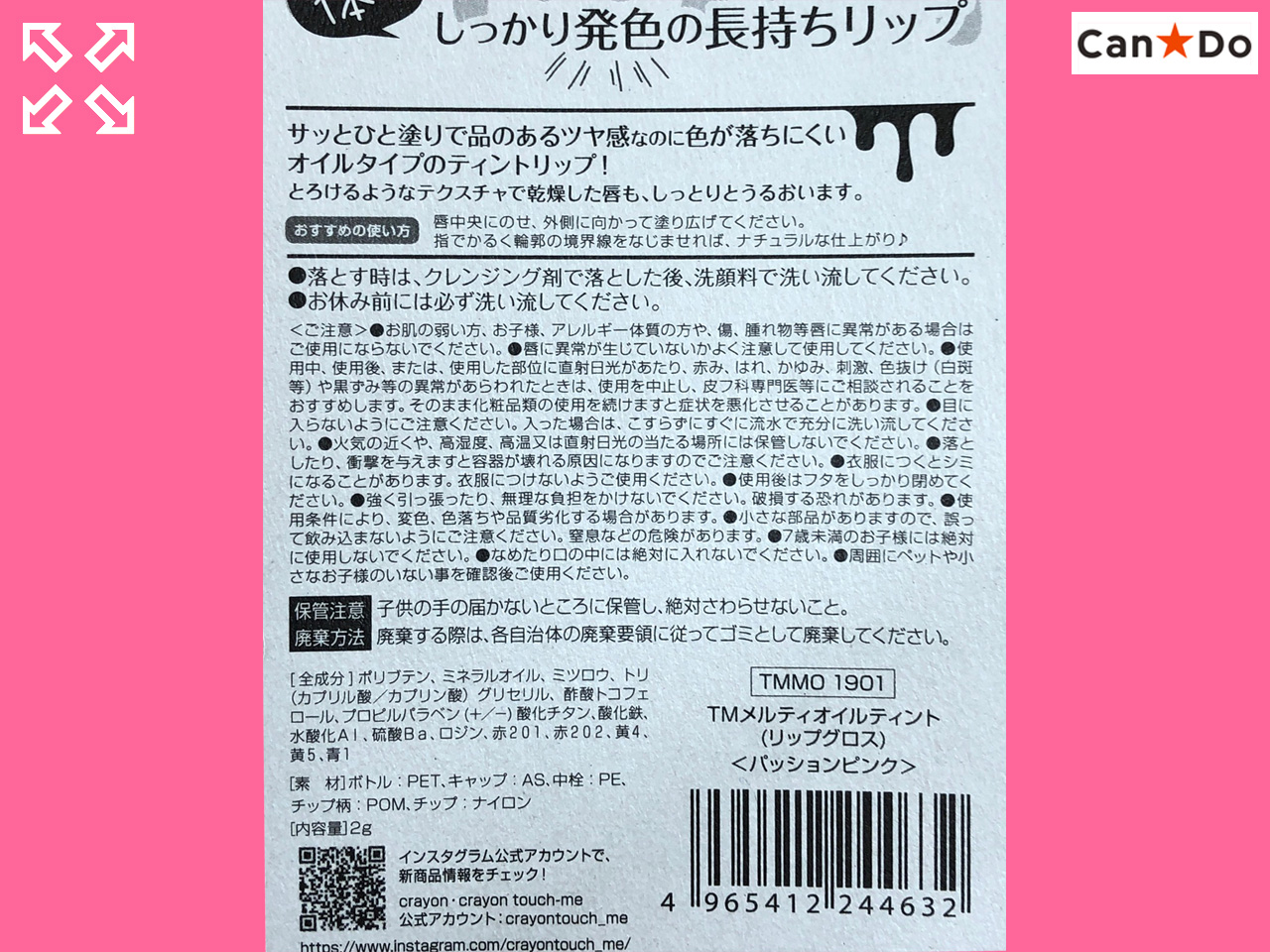 ■キャンドゥ(2020〜) キャンドゥだけで販売されている潤いで評価の高いティント。 全4色 ①パッションピンク ②ファインオレンジ ③コーラルピンク ④ルビーレッド 内容量:12g (台湾製)