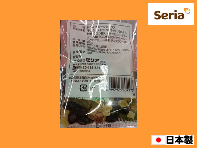■セリア(2015〜) セリアがシリーズ展開している製菓用の材料。 2種類あるフルーツミックスのうち、レーズン入り 同系列で展開している、ミックス粉に混ぜることで、手軽にフルーツケーキが楽しめる。 干しぶどう、ドライパパイヤ、ドライマンゴー、ドライクランベリー がミックスされている。 内容量20g