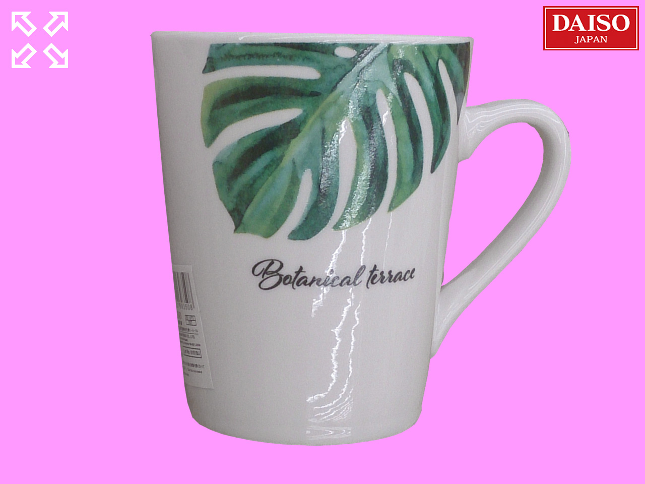 ■ダイソー(2020〜) 皿とのトータルコーディネイト『ボタニカルテラス』のマグカップ。画像3は、シリーズのソーサー。 容量:210ml サイズ:高さで約9cm レンジ◎ 食洗機◎ (中国製)