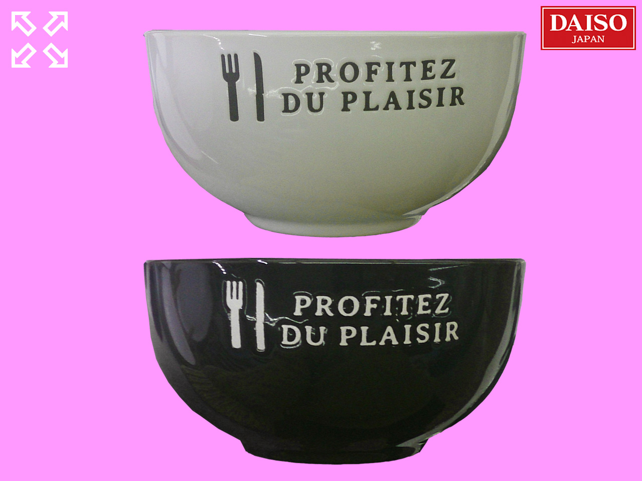 ■ダイソー(2019〜) ダイソーが2019年11月から展開したモノトーン食器『プチボヌール』シリーズのボウル、容量350ml。 表記の『Profitez du plaisir』は、フランス語で「娯楽を楽しむ」みたいな意味。 サイズ:直径約13cm×高さ7cm レンジ◎ オーブン× 食器洗い機◎ (中国製)