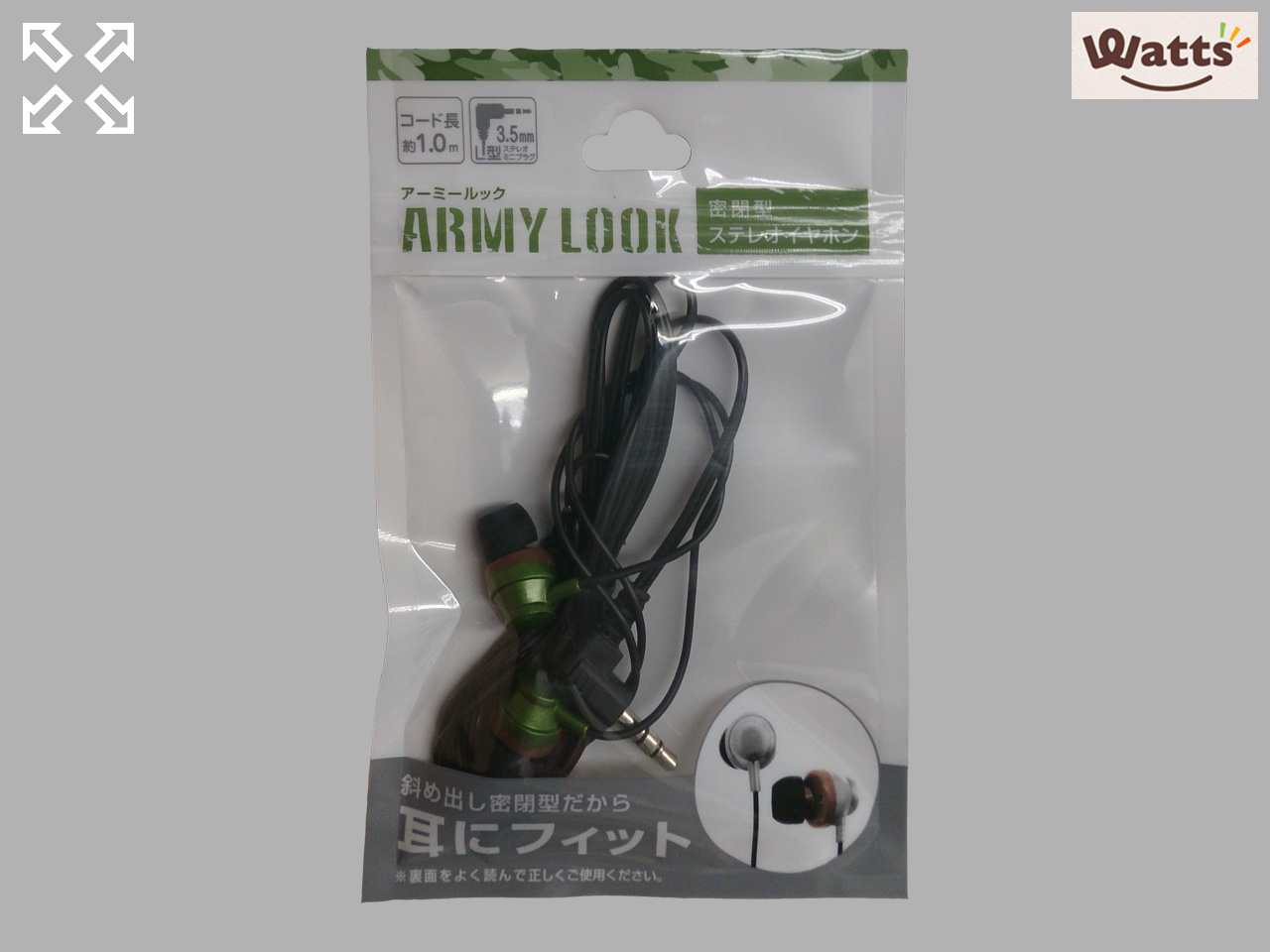 ■ワッツほか アーミーカラーの密閉型ステレオイヤホン。 イヤーパッドも、耳にフィットするような形状になっている。 コード長は100cm (中国製)