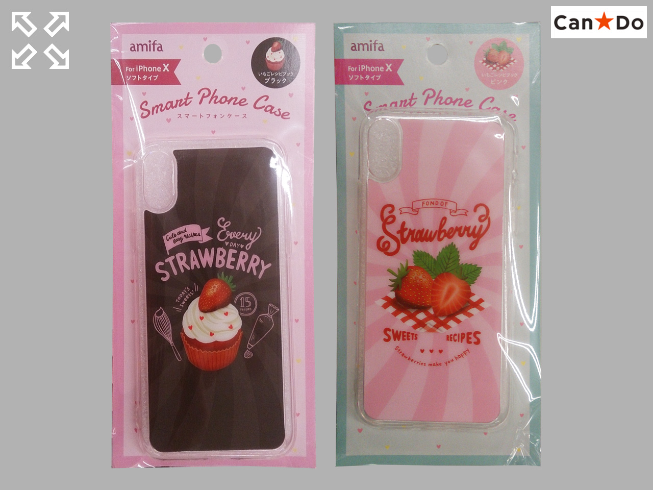 ■キャンドゥほか(2019〜) amifaが、2019年末から展開した『いちごシリーズ』から。iPhoneX用ソフトケース。 サイズ:7cm×14cm×厚さ8mm (中国製)