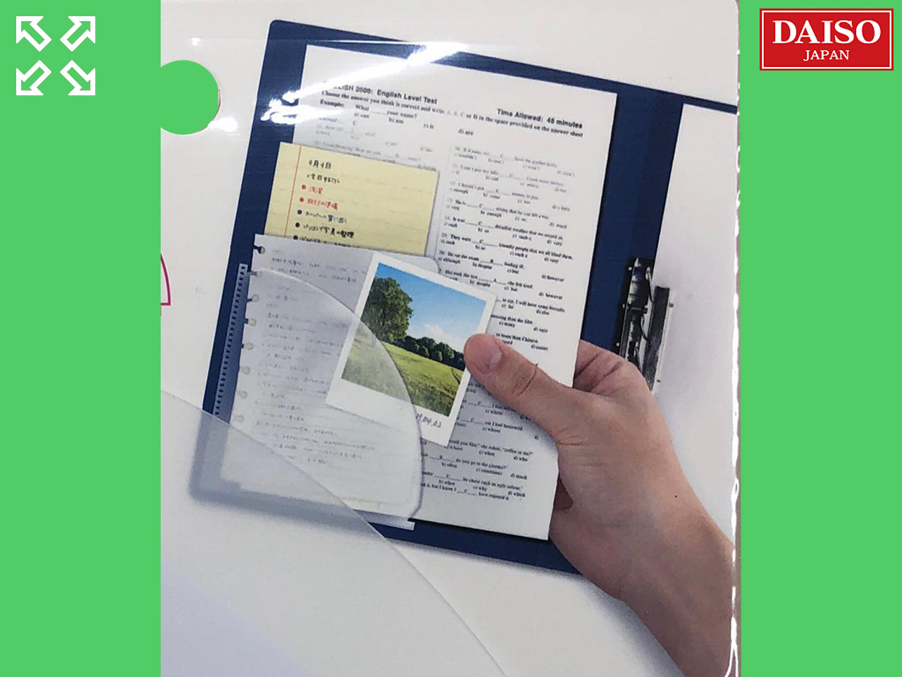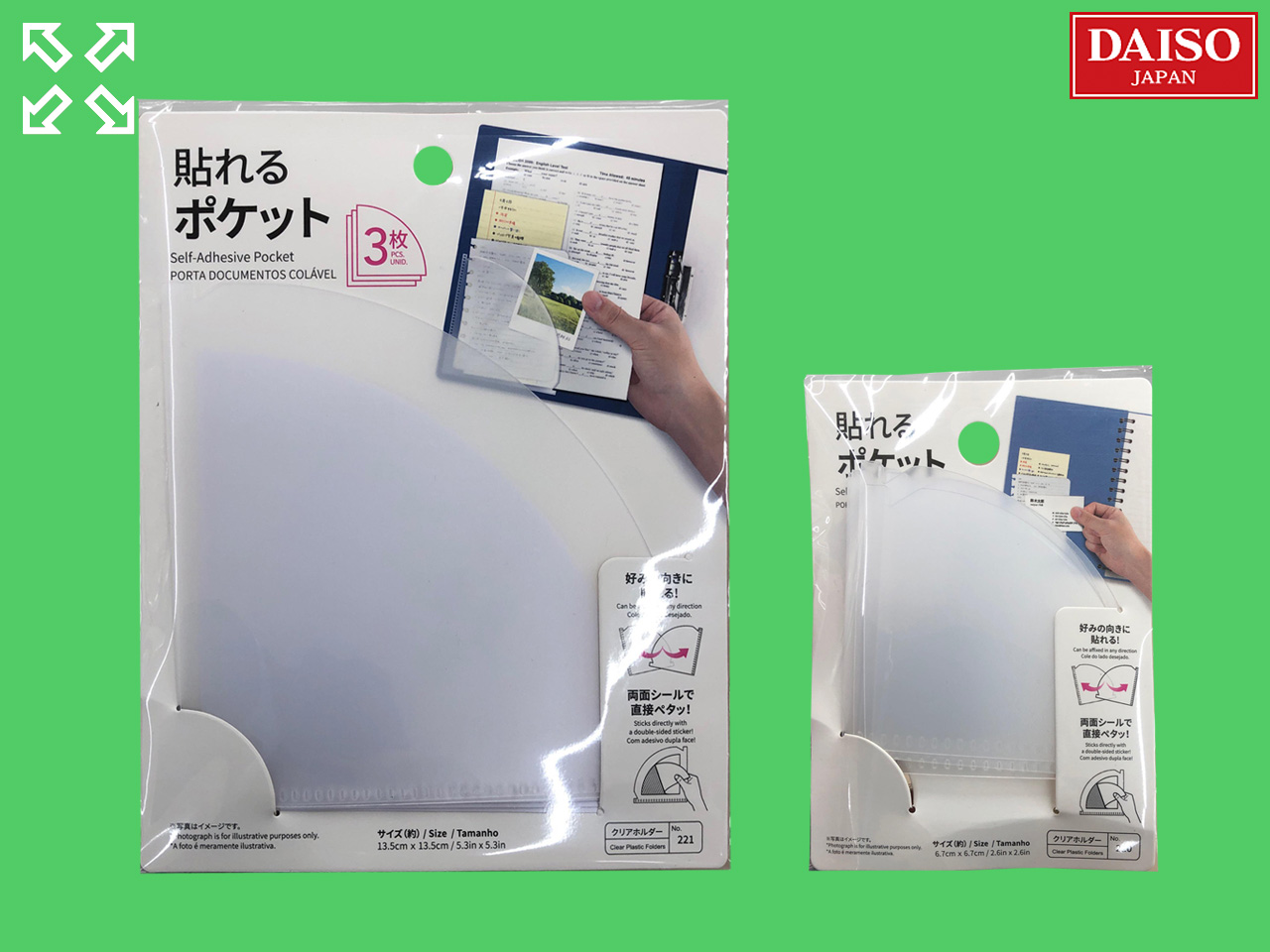 ダイソー(2020〜) ノートなどの表紙裏に貼り付けるポケット。大(3P)と小(9P)の2種類。 サイズ 大:13.5cm×13.5cm 小:6.7cm×6.7cm