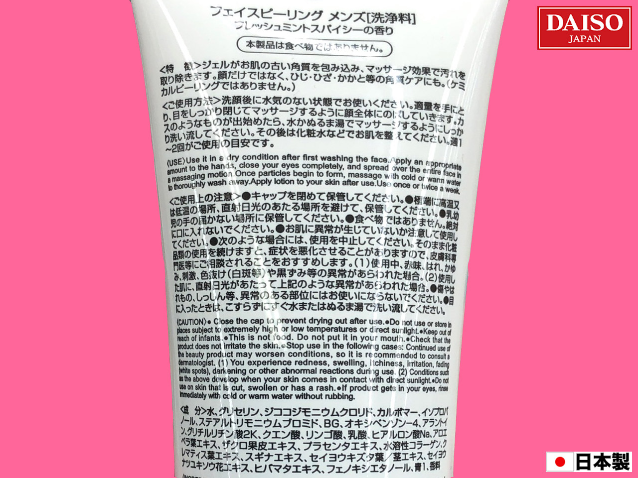 ダイソー(2020〜) 男性用角質落としのジェル。顔以外にも足、腕などの角質にも使える。 比較的水分多め。※ケミカルピーリングではない。 内容量:50g (日本製)