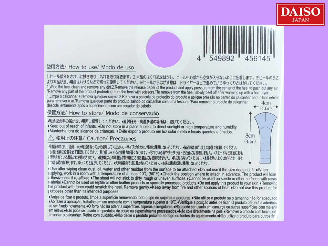■ダイソー(2020〜) 傷つきやすいヒールのカカト部分をガードするためのフィルム。 幅4cm、高さ8cmまで対応できる。 (中国製)
