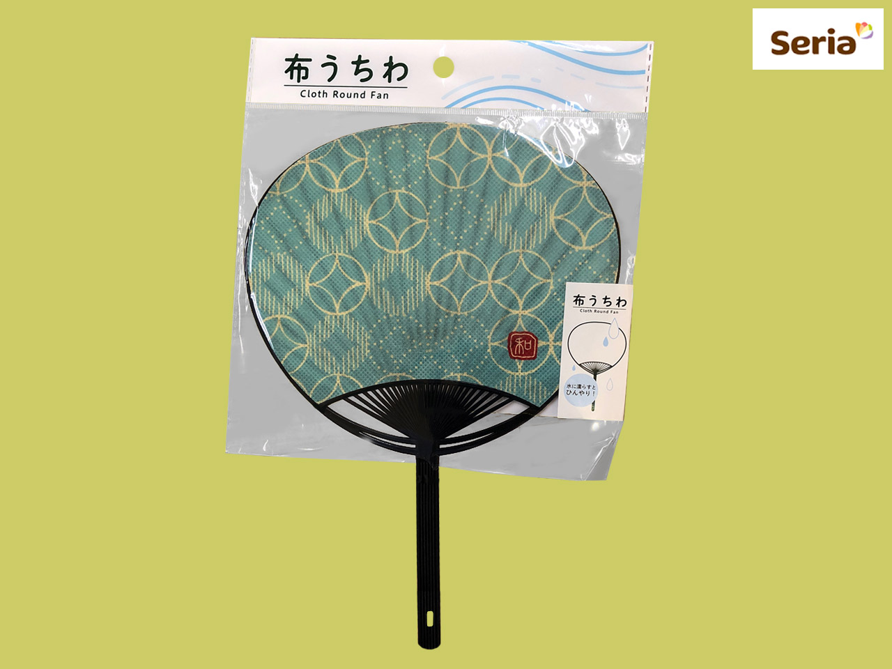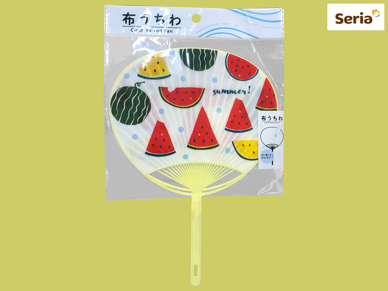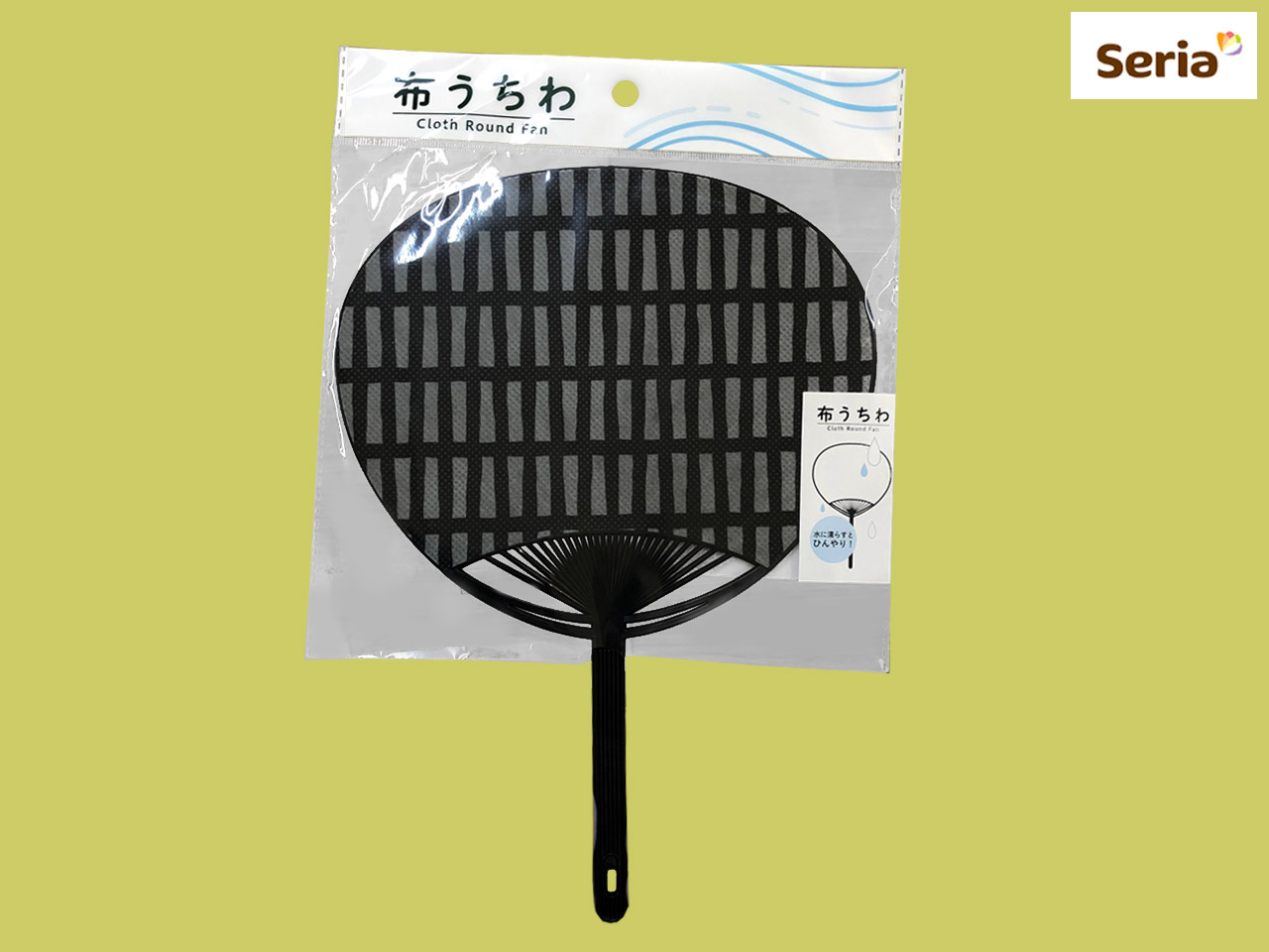 ■セリア(2017〜) 水に濡らして使う布製の団扇。 サイズ:28cm×18.7cm (中国製)