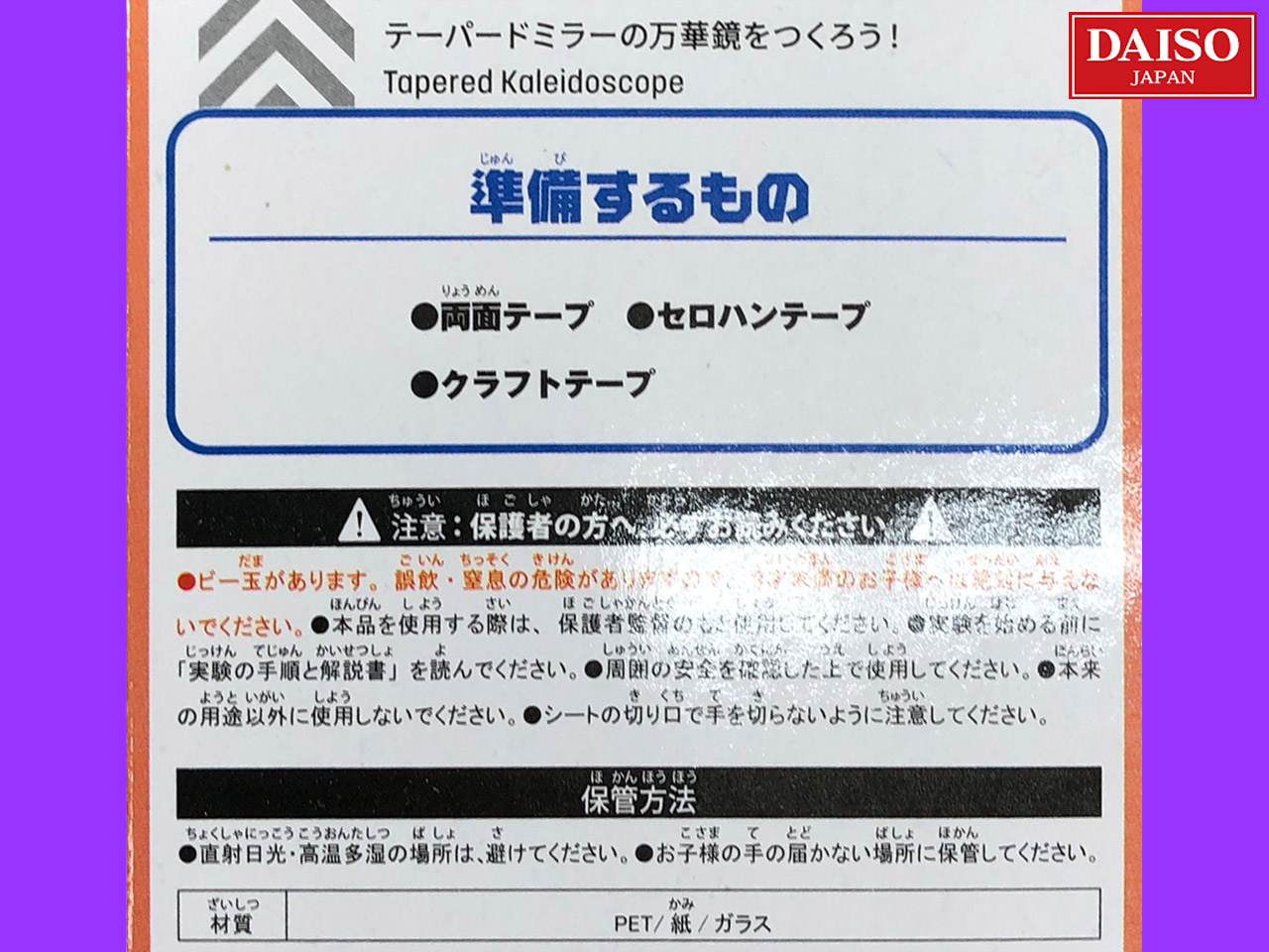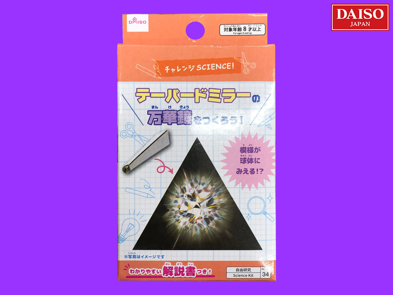 ■ダイソー(2020〜) 2020年から発売されたチャレンジサイエンスシリーズから、『テーパードミラーの万華鏡をつくろう!万華鏡をつくろう』。 テーパードミラーとは、覗く側から物体側に向かって、先が細くなっているミラーシステムのこと。 (中国製)