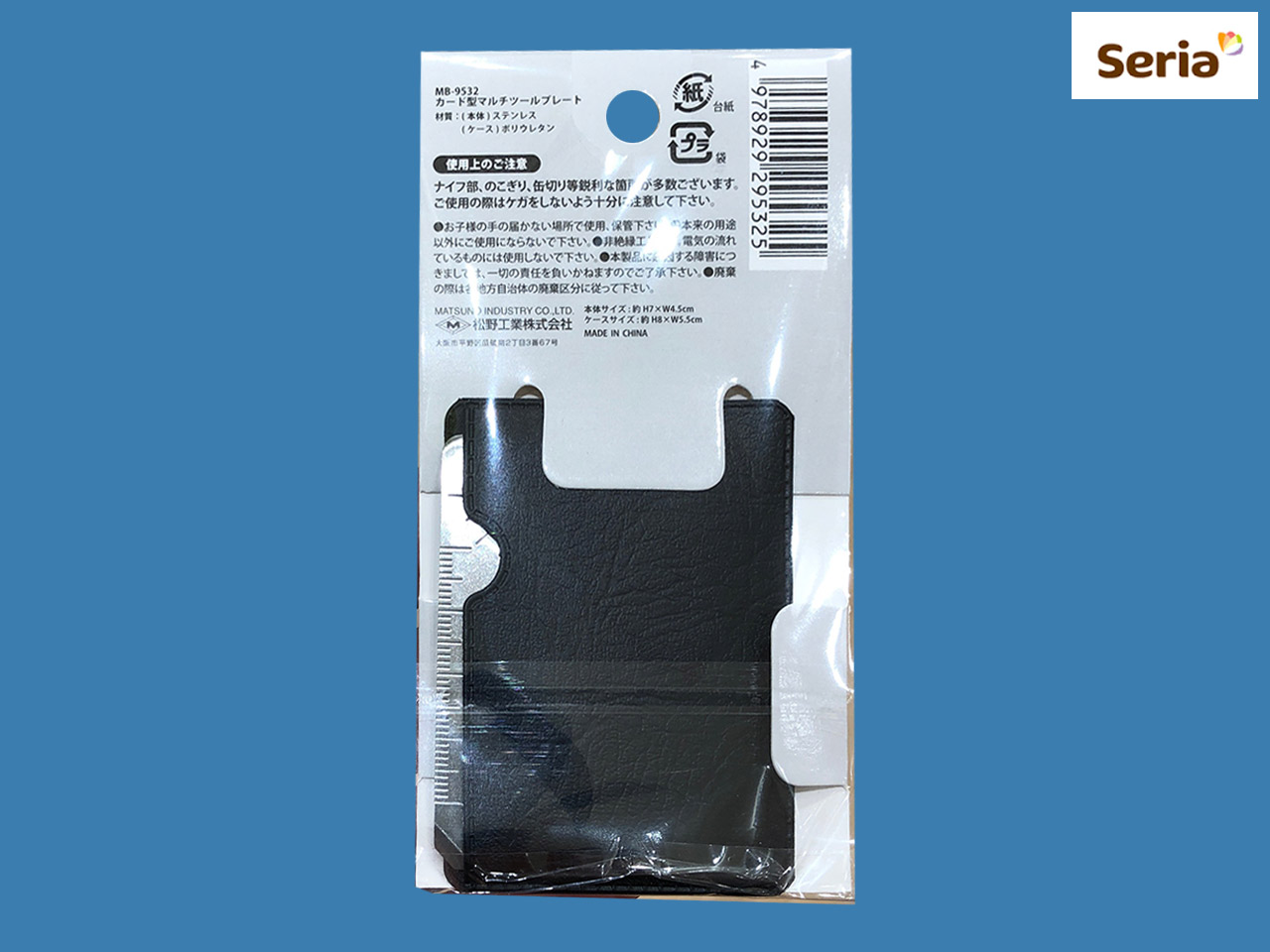 ■セリア アウトドアや災害時に便利な携帯型マルチツール。 カード式の薄型タイプで、収納用の専用ケース付き。 機能は ・ナイフ ・缶切り ・簡易のこぎり ・ヒートンまわし ・キーホルダー用穴 ・栓抜き ・六角レンチ(6サイズ) ・簡易方向読み ・マイナスドライバー ・スケール サイズ:7cmx4.5cm(本体) 8cmx5.5cm(専用ケース) 材質:ステンレス(本体) ポリウレタン(専用ケース) (中国製)