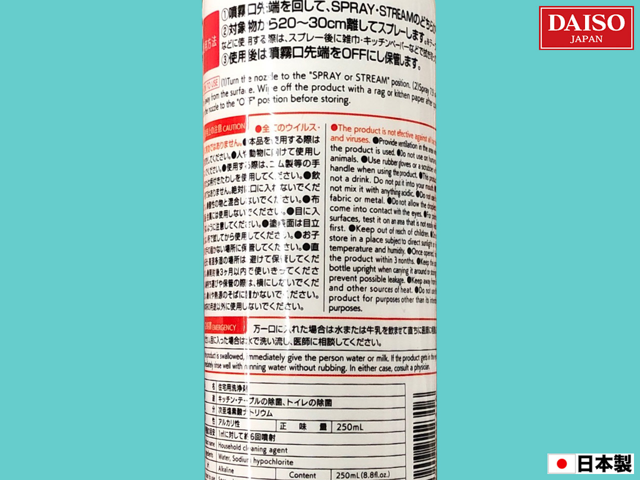 ダイソー(2020〜) キッチン、トイレに使えるスプレー式除菌剤。 内容量:250ml (日本製)
