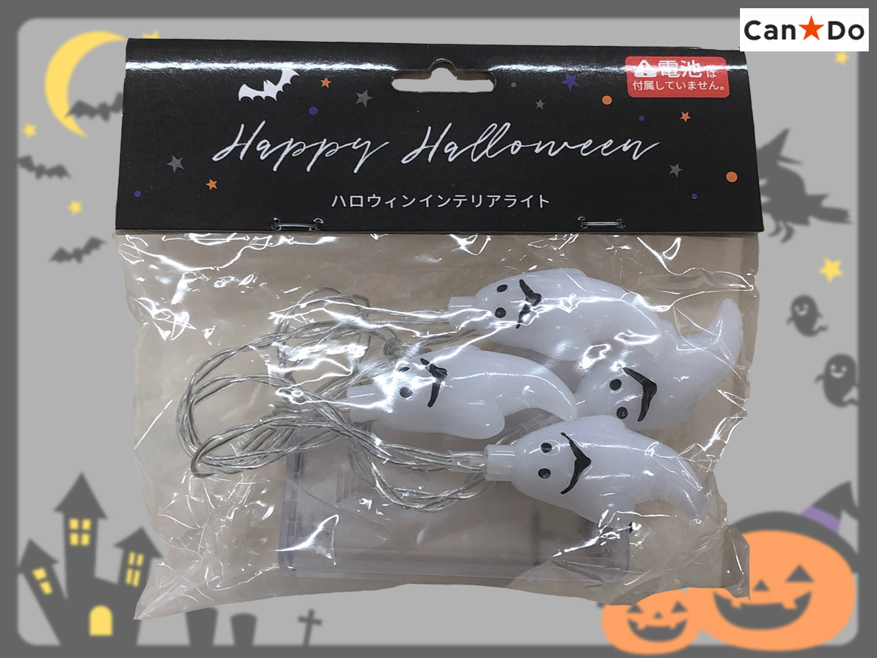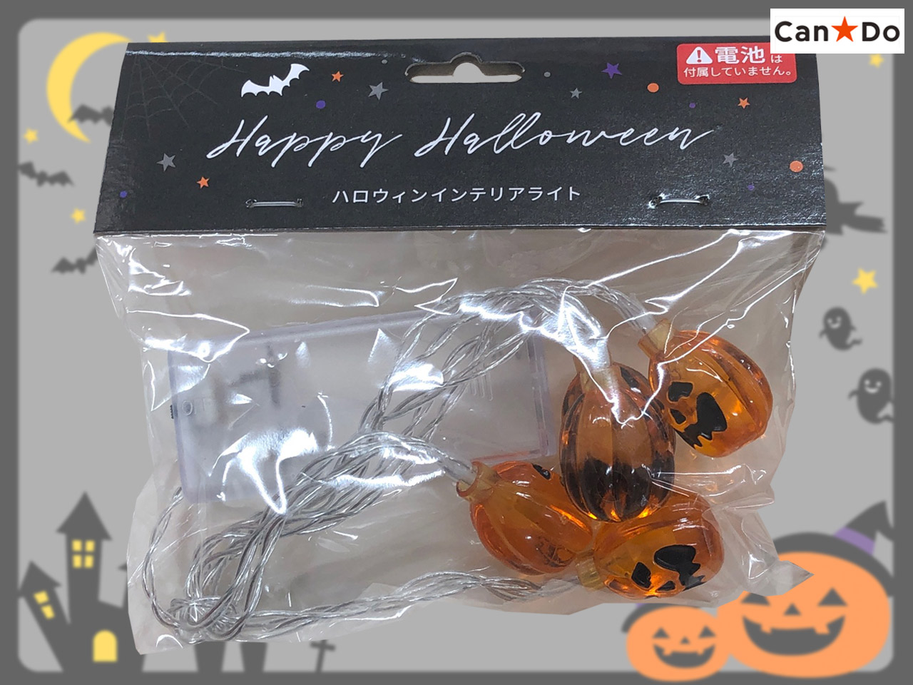 ■キャンドゥ(2020〜) 電池ボックス式のケーブル型LEDライト。 ケーブル長:約100cm LED数:5灯 単三型電池2本使用。 連続店頭時間約50時間。「カボチャ」と「オバケ」の2種。 いずれも常時点灯式 (中国製)
