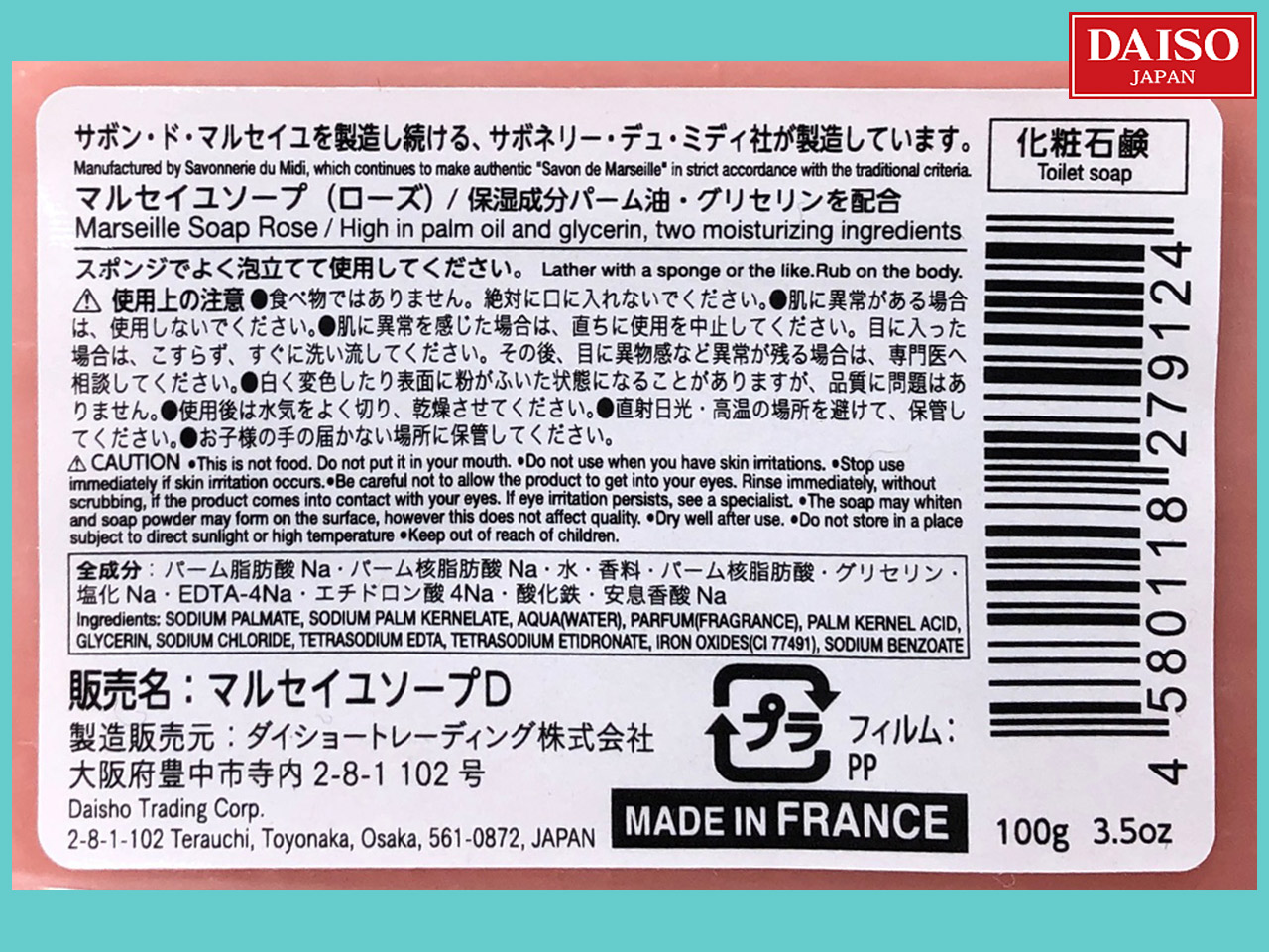 ■ダイソー(2018〜) フランスは、サボネリー・ディ・ミディ社の製造する香水石鹸、4種類。 ①ローズ ②ハニー ③オリーブ ④ジャスミン 内容量100g (フランス製)