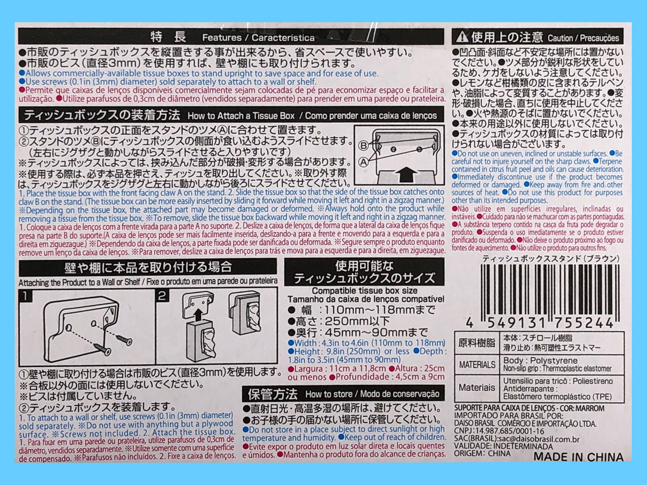 ダイソー(2019〜) 名前通り、ティッシュボックスを立てておくスタンド。 壁に取り付けることも可能。 (中国製)