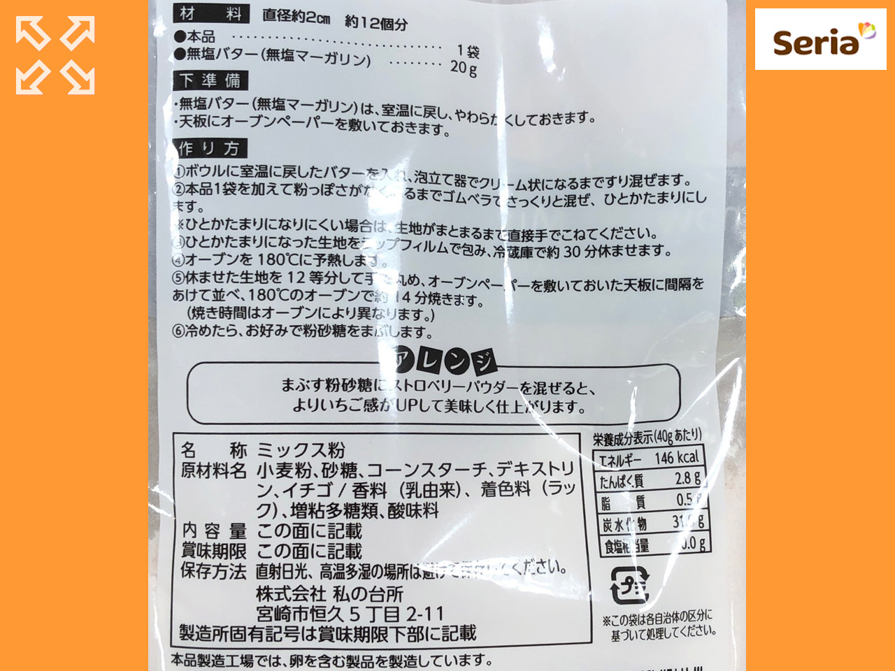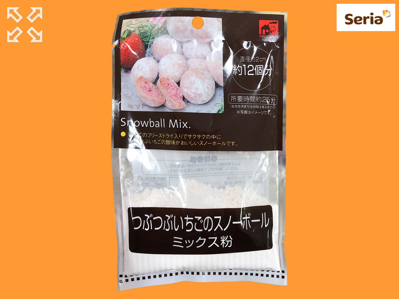 セリア(2019) セリアがシリーズ展開しているケーキミックス粉の新シリーズ。イチゴのスノーボール。 2cmのスノーボール約12個分。 調理所要時間は約25分。