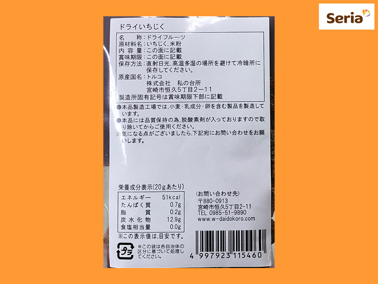■セリア セリアがシリーズ展開している製菓用材料から、ドライいちじく。 ダイス型にカットされているので、パンや焼き菓子等に混ぜ込める。 もちろんそのままでも食用可。 内容量:20g (トルコ産)