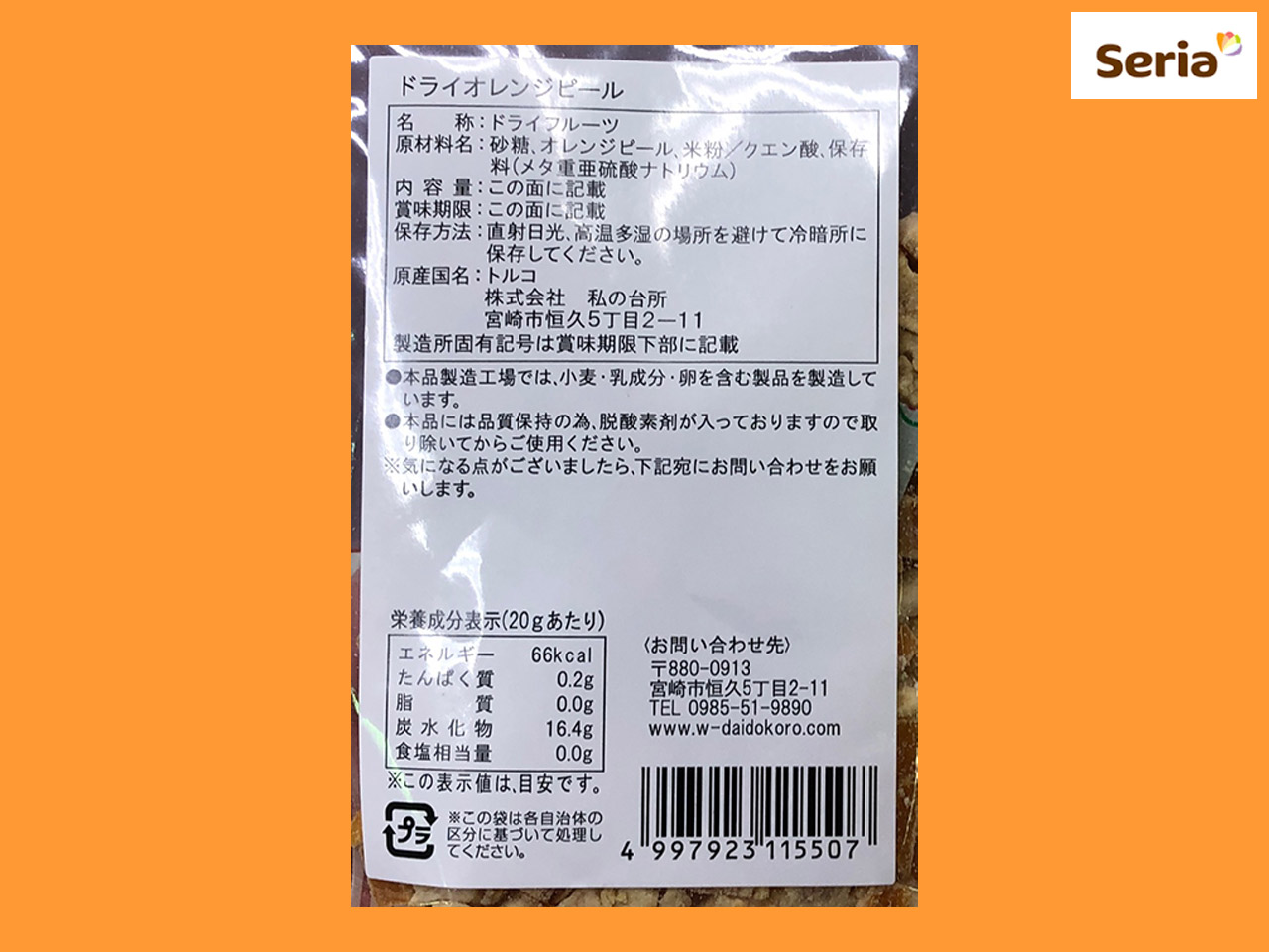 ■セリア セリアがシリーズ展開している製菓用材料から、ドライオレンジピール。 シロップ付けのオレンジの皮をドライ加工したもの。 パンや焼き菓子等に混ぜ込んだり、トッピングとしても使用できる。 もちろんそのままでも食用可。 内容量:20g (トルコ産)